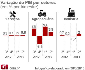 Na comparação com o segundo trimestre de 2012, o PIB cresceu 3,3%. Nesse caso, a alta na agropecuária foi de 13%, seguida por indústria, com aumento de 2,8%, e serviços, com alta de 2,4%, diz o IBGE.