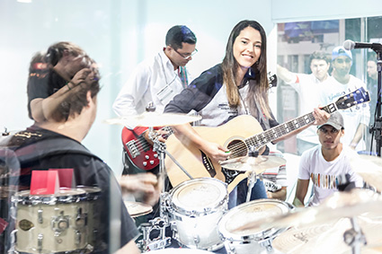 As meninas marcam presença nos estandes não só ao esbanjar beleza e simpatia, mas também despejando o seu som e musicalidade em diferentes estilos e instrumentos.