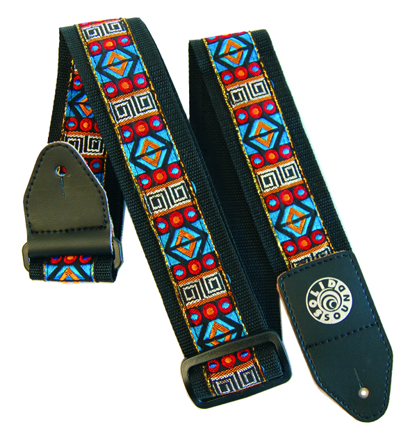 Correia colorida com detalhes gráficos, fabricada em cadarço e gorgurão. Ponteiras em couro.